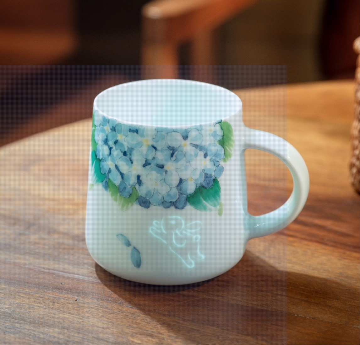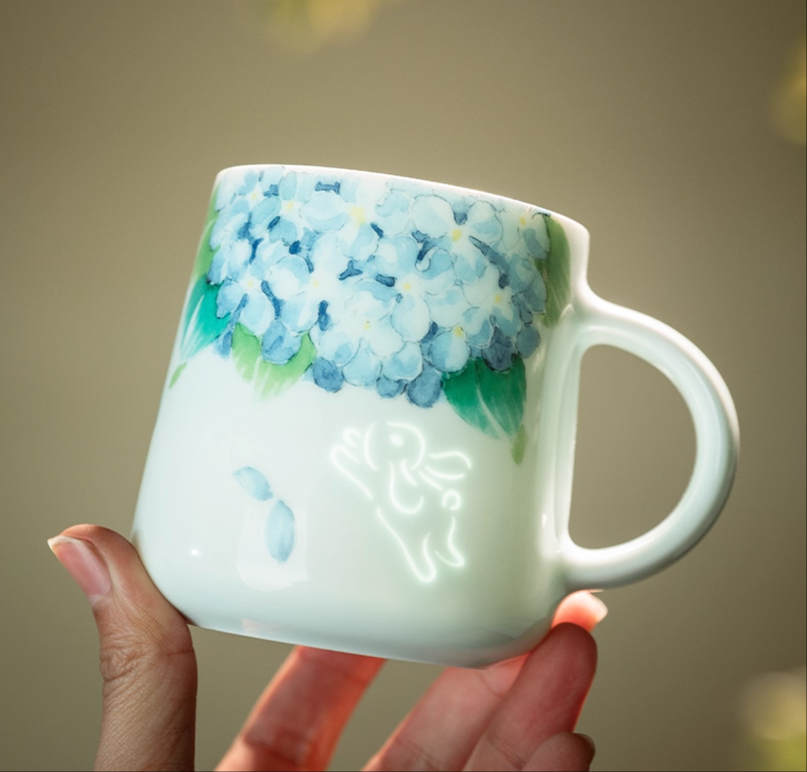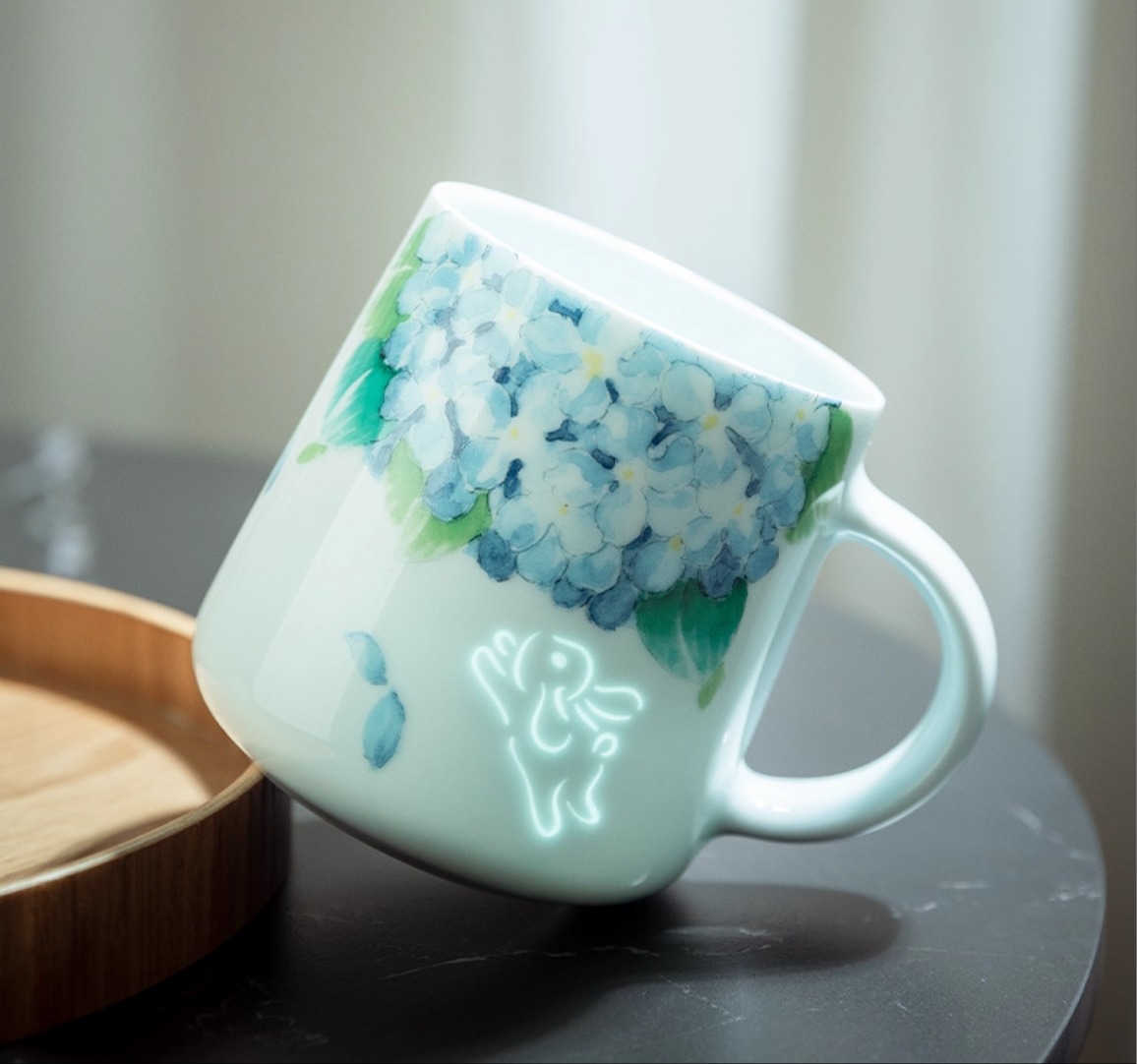 A whisper of magic in every sip. This mug captures the playful energy of a rabbit mid-leap, glowing with a soft ethereal light when touched by darkness. Hand-painted with delicate hydrangeas in serene blue and green, it blends pastoral charm with a touch of whimsy.